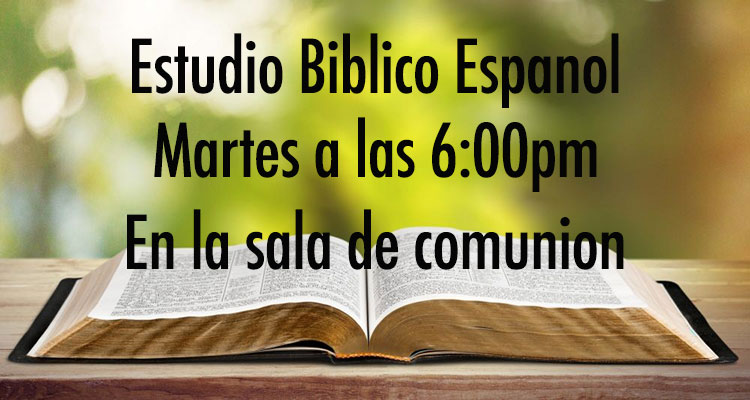 Cada martes a las 6:00 PM tenemos un estudio bíblico en español dirigido por el pastor Nale a través de uno de nuestros traductores de habla hispana. El estudio de la Biblia se reúne en el Salón de la Comunidad..